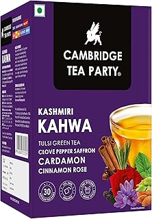 Cambridge Tea Party Kashmiri Kahwa 30 Tea Bags, Saffron Almond Cardamom Clove Pepper Cinnamon Rose Tulsi Green Tea, 75 grams